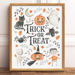 Read the full title Trick or Treat Printable Wall Art, Watercolor Halloween Printable Decor, Halloween Party Decorations, Rustic Halloween Trick or Treat Decor