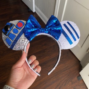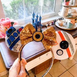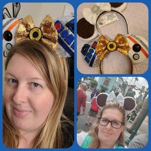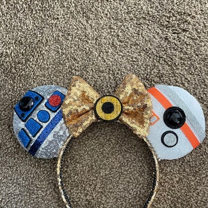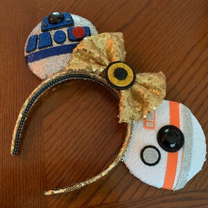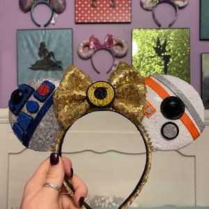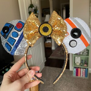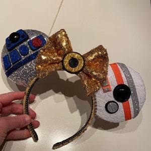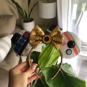 These Droid ears are handmade with several fabrics to represent each droid. Silver sequin fabric for R2D2, white sequin for BB8, and a gold sequin bow and band for C3PO, the bow is backed in gold satin with hand painted embellishment. Each is embellished with characteristics to represent that character.