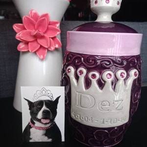 Personalized Dog Treat Jar Orange and Black Spiky Collared Ceramic Pet Container Made To Order by Symmetrical Pottery