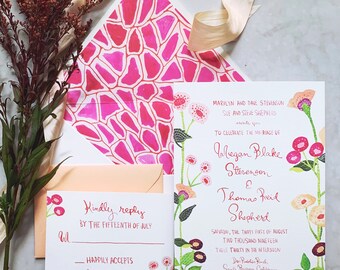 Custom Watercolor Wedding Invitations / Custom Painted Wedding Invitation Suite / Pink, Coral and Red Flowers Wedding Invitation