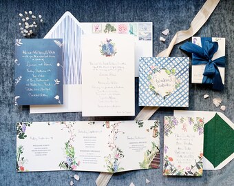 Custom Watercolor Wedding Invitations / Custom Painted Wedding Invitation Suite / Blue and White Invitation Suite with Garden and Lattice