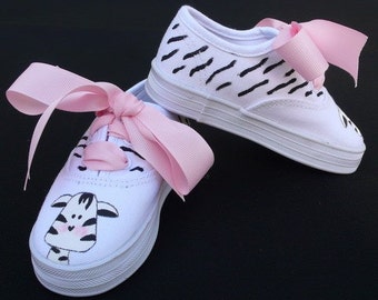This style is a delight to all monkey lovers! Hand painted monkey on light pink canvas upper with heart designs on remainder of shoes. Hot pink grosgrain ribbon for all girls styles. Ribbon "sealed" to help prevent fraying. (view shoe size chart in policy section for size determination).