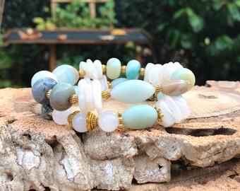 Joie de vivre bracelet set Moonstone Amazonit Larimar gem bracelet Gold Mala