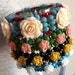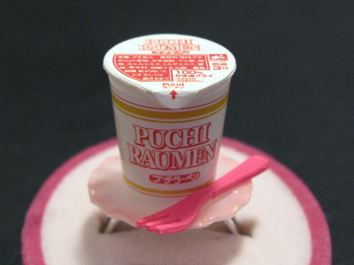 Mini ramen noodles cup is about 3/4 " tall, and the pink dish is about 3/4" in diameter. Sided with a hot pink fork.