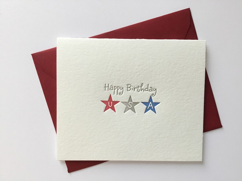 Happy Birthday USA card! Deep text, three-color lettterpress.