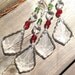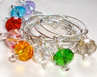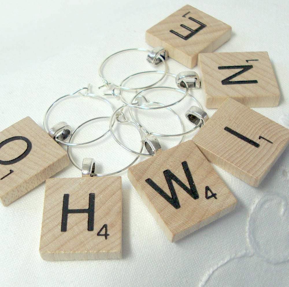 Scrabble wine glass charms - wood - your choice of 6 letters (EXCEPT J and K - see note below). These scrabble tile wine glass charms are perfect for your holiday entertaining - or as a hostess gift! This set of six features an authentic wooden scrabble tile glued to a Tibet silver bail through which a silver plated hoop goes through. The hoop will circle a stemmed glass (or a narrow handled cup).