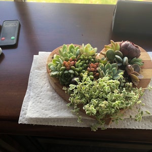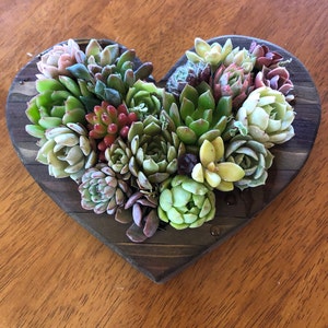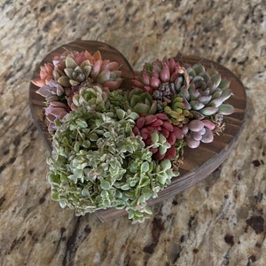 8 inch succulent heart just like our 12 inch version larger size are on another listing so if interested in a larger heart just search for it on our page . Solid cedar wood succulent planter that stands alone , lays flat or hangs . These are filled with dozens of mini succulents and make a perfect gifts for anyone . Or a gift for yourself and your home . We carry may types of shapes and designs I. Our shop . These make a great gift for upcoming Valentine’s Day . They have lathe wire backs that allow proper airflow and drainage . This allows your succulents to stay in this planter Indefinitely . Care is simple provide proper indirect sunlight so the succulents stay compact don’t stretch and stay colorful. Watering is dependent upon your environment . I water mine one time a week with 1/4 cup of water gently spread over the whole planter . These only need teaspoons amount water to care for .and bright light . Lay flat before hanging to let it root well and establish in the planter . These are built by hand then planted for each order