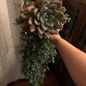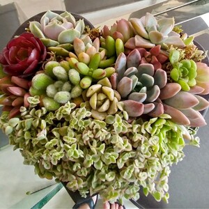 Nicole created yet another masterpiece....how she packs together so many plants in a small space is just incredible. Meticulously done, with a stunning array of colors and texture, you will not find another succulent arrangement of this quality elsewhere!! And she is open to customizing paint/stains for the planters...more than happy to review colors with you beforehand....