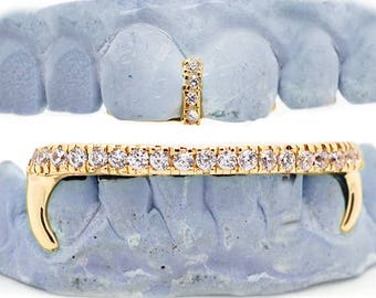 Custom Diamond Bar Grillz 10K 14k Gold Grillz Gap Bar Iced Out CZ Custom Grillz Top & Bottom SET Kim Kardashian Grillz