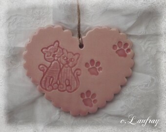 Heart made of earthenware with Scalloped edges, couple of cats in love, pastel pink