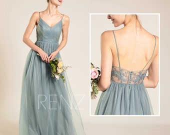 Prom Dress Dusty Blue Maxi Dress,Wedding Dress,Ruched V Neck Tulle Dress,Spaghetti Strap Bridesmaid Dress,Illusion Lace A-line Dress(HS579B)