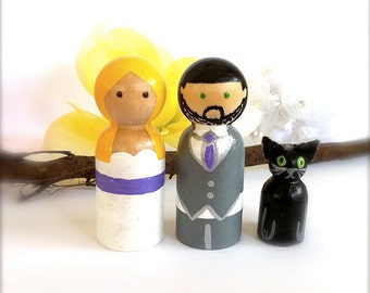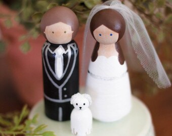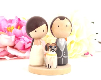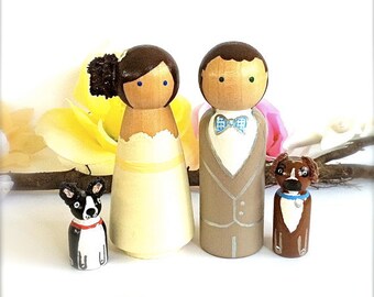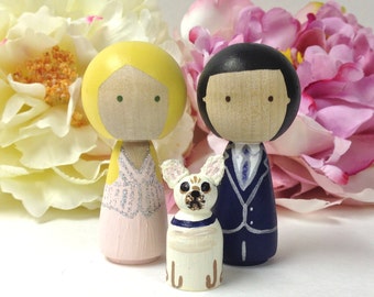 This listing is for a custom personalized natural wood peg doll set wedding cake topper, bride and groom + 1 pet.