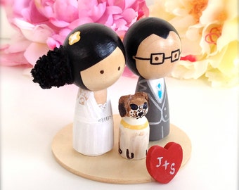Custom WEDDING CAKE TOPPER With Pet and Stand, Personalized Kokeshi Doll Wedding Cake Toppers, Peg Doll Cake Topper, Peg People