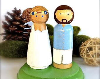 Wedding cake topper bride and groom wood peg doll set, has been hand painted and sealed using non-toxic materials. The sealer is non-yellowing and is water resistant,