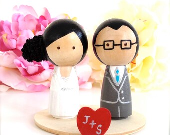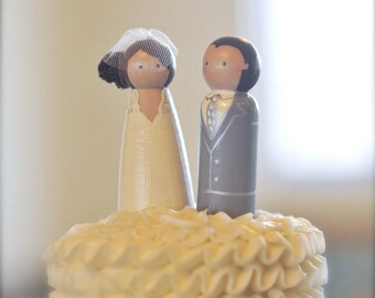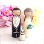 This bride and groom set of wood peg/ peggies/ peg people dolls are fully custom. You choose everything for your dolls, from eye and hair color and style/ accessories, to dress and suit color and style. Send me photos of your wedding attire, and I will match it to your dolls :)