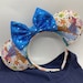 These Splash Mountain ears are made with splash mountain fabric on both sides, with blue sequin trim and a blue sequin bow on the front side only. One size fits most.