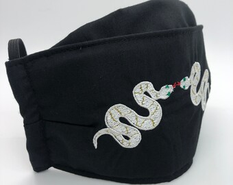 All cotton, breathe-able, with elastic bands over the ears and a hidden pocket for filter (filter is not included) one size fits most.