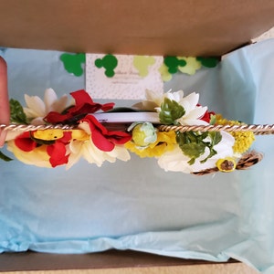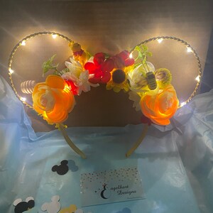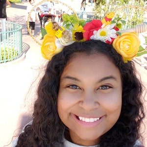 Beautiful Monarch butterflies adorn these one-of-a-kind floral Disney ears. This headband features a variety of vibrant flowers, perfect for sunny summer days at the parks. The gold wire ears are made with double wire for durability so you never have to worry if your ears will bend when you put your them in the storage compartments on rides. These butterfly floral ears are assembled onto a comfortable headband, perfect for all day wear.