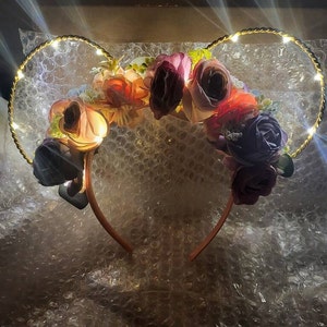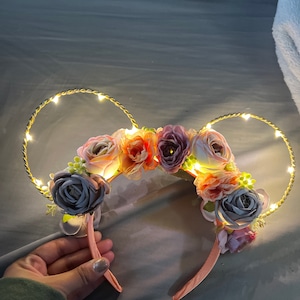 Butterfly Garden Ears Gift for Her, Pink Floral Ears with Orange Roses, Flower and Garden Disney Mouse Ears with Fairy Lights, Gold Wire