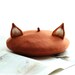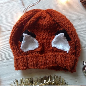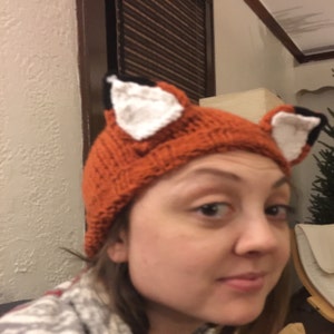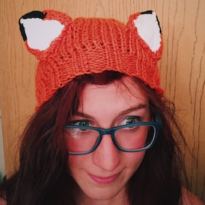 Handmade knit hat with fox-orange-red yarn and ear detailing. Comfortable and warm. Perfect for any fox enthusiast.