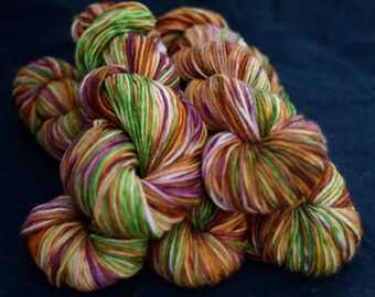 Sock Yarn, Hand Dyed, Superwash Merino Wool, 'Day at the Vineyard', Burgundy, Burnt Orange, Lime Green, for knitting