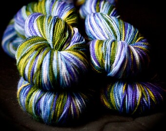Sock Yarn, Hand Dyed, Superwash Merino Wool, 'Rainy Day Cheer', Purples & Greens, for knitting