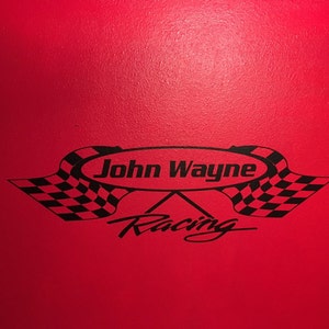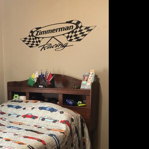 Personalized Crossed Checkered Flag Wall Decal Single Color. Great wall decal for the kids into racing. We will substitute the "Name Here" with the child's first name or last name or both. Just keep in mind that the more letters that you add to that area the smaller the lettering will have to be.