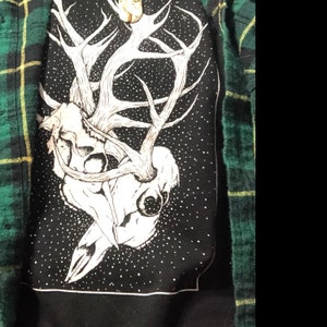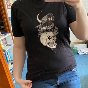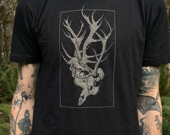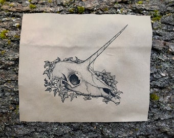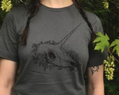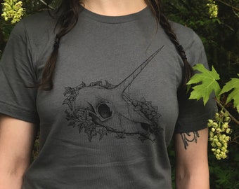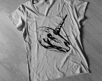 Unicorn skull illustration printed on Bella + Canvas unisex shirts in charcoal grey