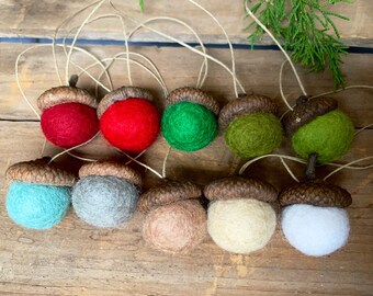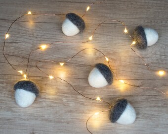 A beautiful garland of of 10 medium sized felted acorns in snow white. Each felted acorns are hand felted using softly spun merino wool and then glued to real acorn caps.
