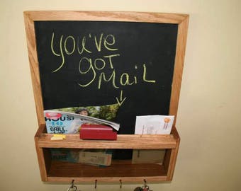 This heirloom quality vintage inspired Bulletin Board or Chalk Board, Keyhook and Mail Slot organizer with shelf is ideal for an office, mudroom, bedroom, or kitchen or anywhere extra organized storage is needed! The cubby can hold mail, an iPhone, Blackberry, etc.....