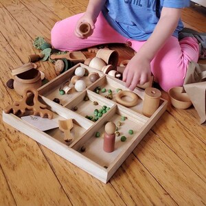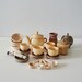 These beautifully crafted wooden toy dishes are ideal for little hands and big imaginations. The wooden play toys include all of the necessary items for that perfect tea party, play dates with friends or pretend kitchens. These Montessori preschool toys are encourage creative and open-end play. Each child dish set comes in a convenient drawstring pouch making it easy to store pieces, haul to Grandma's or to church for those fidgety little ones. Great gender neutral toddler birthday gift idea. Beautiful neutral wood makes these toddler toys a perfect addition to any modern and minimalist play room when not in use without looking like clutter.