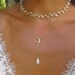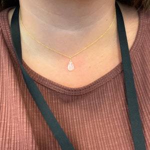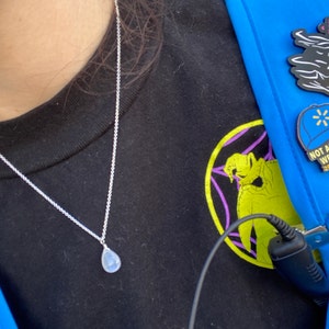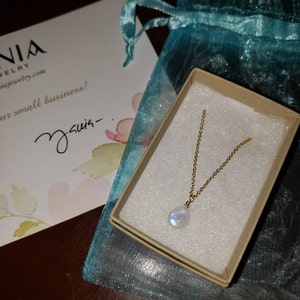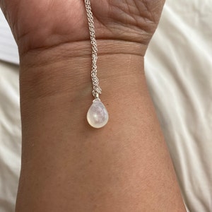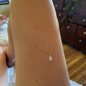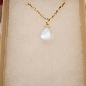 This simple and classic necklace features a smooth blue fire rainbow moonstone tiny teardrop suspended from a dainty chain in your choice of gold filled or sterling silver. This is the perfect summer necklace and is a classic effortless look for all ages.