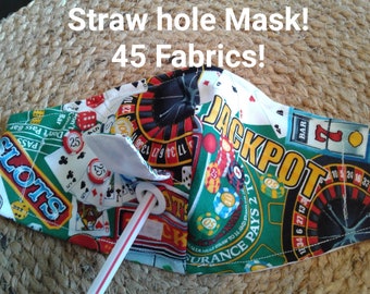 The Socialite Straw Hole Face Mask covered open grommet for straw opening - nose piece & adjustable ear straps - multiple prints available.