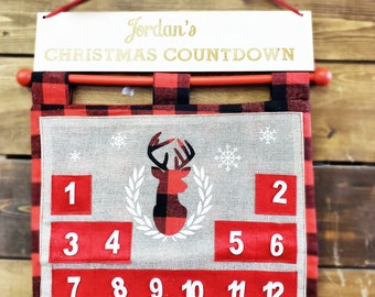 Personalized Advent Calendar Farmhouse Buffalo Plaid Deer Fabric Felt Advent Christmas Countdown Calendar for Kids