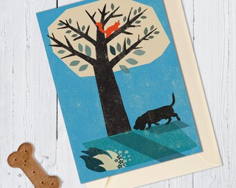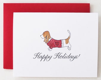 This illustrated Basset Hound dressed in his green scarf and ski's is sure to make any recipient smile for the holidays.