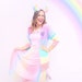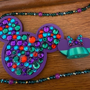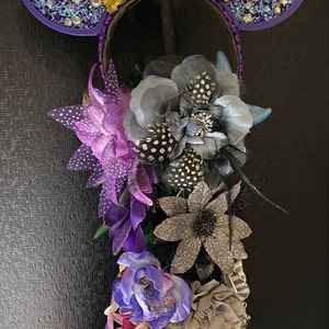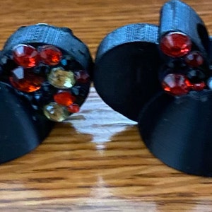 A dazzling black crown made of metal filigree pieces with hand placed iridescent rainbow rhinestones.