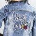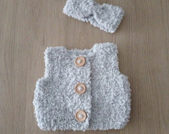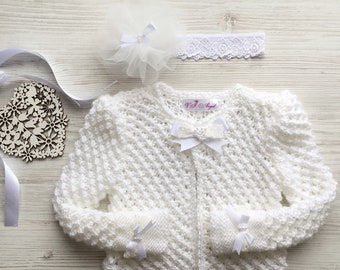 Jacket is decorated in the same lace as a dress and headband. Litlle white satin rose sits on the headband and tote bag.