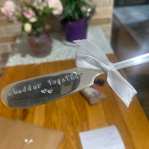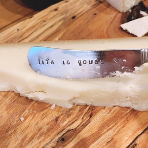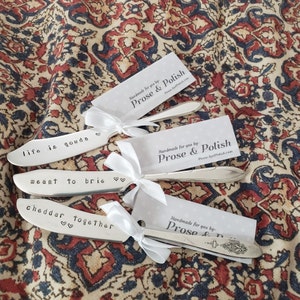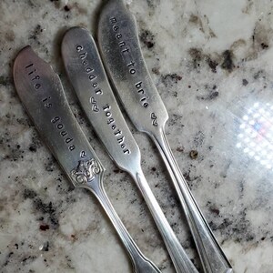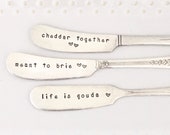 Vintage silver cheese spreaders, Cheddar Together - Meant To Brie - Life is Gouda, hand stamped spreaders, housewarming gift