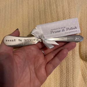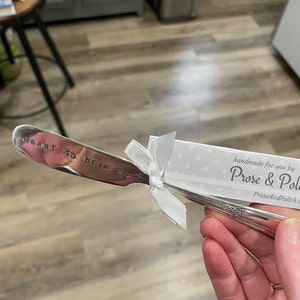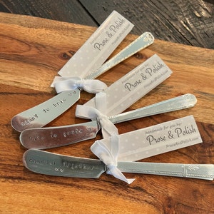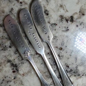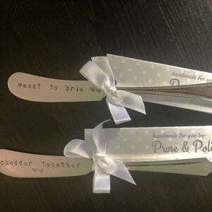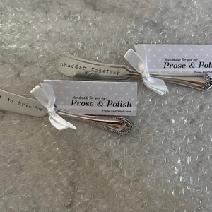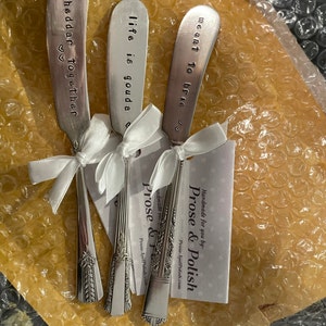 5 out of 5 starsI saw these vintage silver cheese spreaders with the cute sayings and thought they were absolutely adorable! I bought all 3 as gifts for a friend’s bridal shower. I was worried they wouldn’t arrive on time so I messaged Kimberly and she responded almost immediately saying she would work on it that night and get it out right away. I received the items way in advance of estimated delivery date and they looked beautiful, just as I expected! I appreciated Kimberly’s friendly professionalism and great customer service and she even left me a personalized note in the package thanking me for my purchase…so sweet!