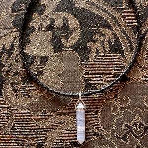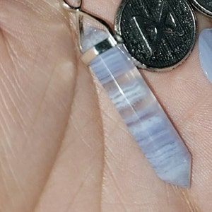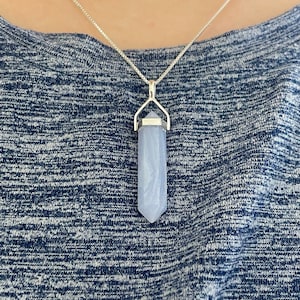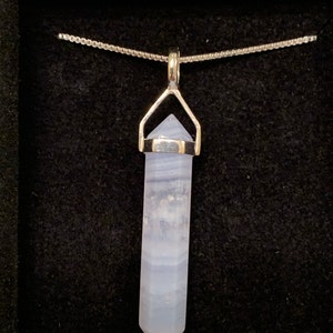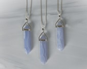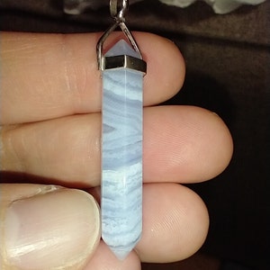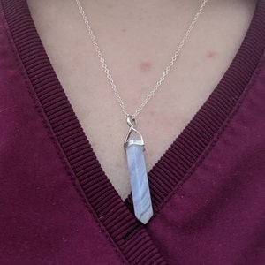 Genuine blue lace agate necklace. Blue lace agate point pendant set in sterling silver hanging from a sterling silver chain in the style and length of your choice. Such a great layering necklace. Blue lace agate is a beautiful light blue stone with white "lace" running through the stone. It is translucent in some areas. Each stone is one of a kind!