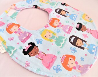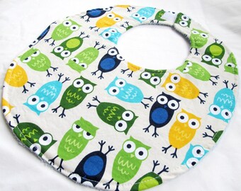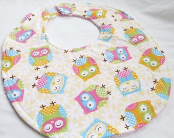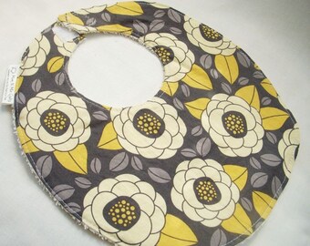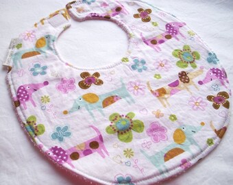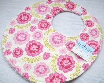 Our signature bib in Birds in Spring print from Ann Kelle. This super soft cotton print is simply adorable. Backed with pink terry cloth.