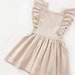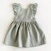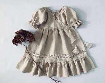 Girl dress made from natural linen. Dress front and bottom is decorated with cotton lace. The neck and sleeve hem at hand.