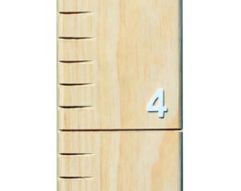 Each growth chart is made of wood and is 5.75 inches wide and 42 inches tall (excluding the ribbon). Measure your child from 2.5 ft. to 6 ft., with markings at each .5 inch. The chart has 3 different sections so that it easily folds for storage.