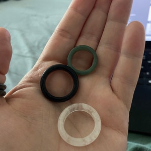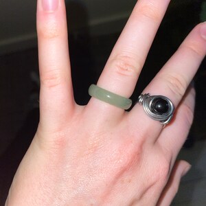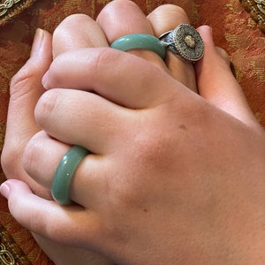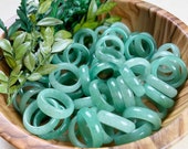These rings are made from green aventurine. The stone is carved into different band rings. Please keep in mind that the color will vary from ring to ring. I cannot accommodate color preferences at this time.