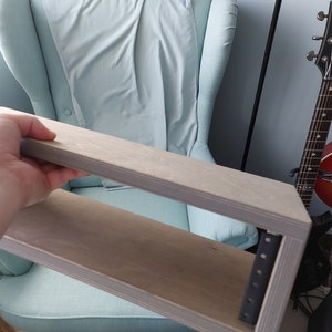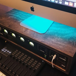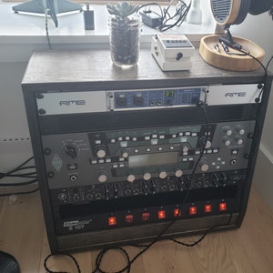 This is a beautiful studio rack! Matthew did a great job! I love the color, the rubber feet that are protecting my desk from scratches, and the small gaps above and below the mounted gear to help with airflow. Due to COVID, a lot of people seem to be returning to hobbies with renewed zeal, so it's no surprise that Matthew is seeing a large influx of orders. The wait was not unreasonably long, and the quality of the product makes it more than worth the wait, but be mindful of the time it takes to take care of such a large number of orders, especially for customized, made-to-order items like wooden racks. I'm very happy with my overall experience and would definitely recommend checking out these racks for anyone in the market for a clean looking, quality, wooden rack to protect and contain their gear.