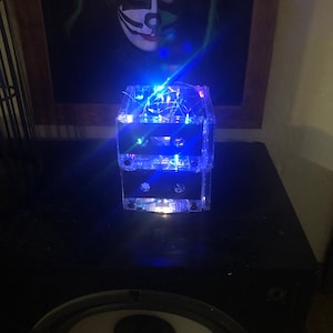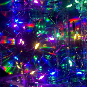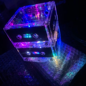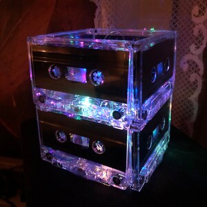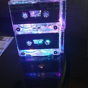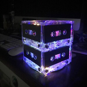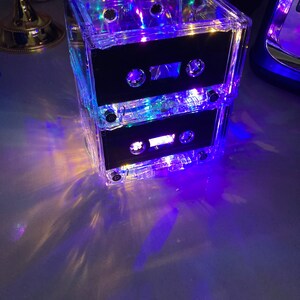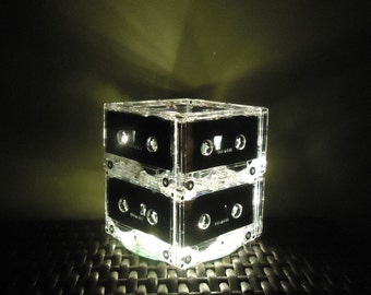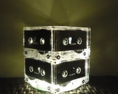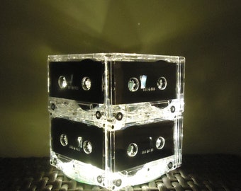 8 Upcycled very rare blank cassette tapes and one CD handcrafted into a super fun rockin' retro night light holding 20 soft white mini LED lights. The very rare cassette tapes used have nothing printed on them, so it has a very sleek clean look. Most people do not realize the lamp is made from cassette tapes until they look closer or you tell them. The effect is beautiful and plenty of light to be a calming room lamp, nightlight or mood light in your bedroom or living area. You will "LOVE" it and so will your guests!