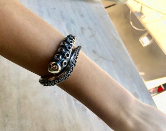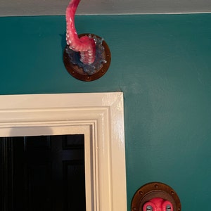 This is a 24" octopus arm cast in urethane. polished and painted, protruding from a 9" round rust encrusted porthole. Extends from the wall 18 1/2".