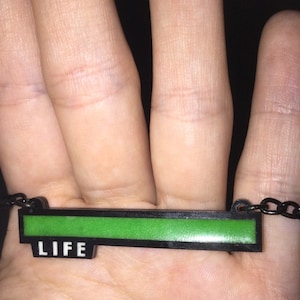 Show everyone your vitality; real or desired, with these stylish pins based on the classic video game life bar! These are our hottest-selling item. They're made from layered acrylic and after being exposed to sunlight, the life bar and lettering will glow green and white respectively in the dark for several hours. :)