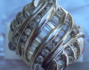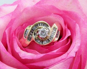 Estate 14k Yellow Gold Diamond Solitaire Baguette Accents Swirl Engagement Ring