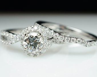 Diamond Halo Swirl Engagement Ring & Wedding Band Set 14k White Gold